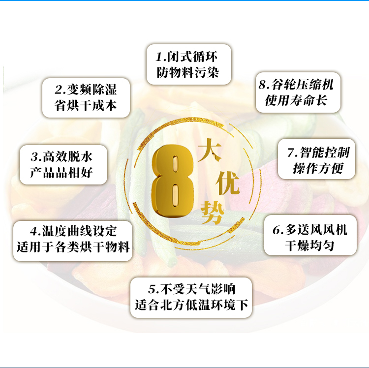 1.先進(jìn)的閉式除濕干燥循環(huán),以除濕方式替代傳統(tǒng)加熱干燥,在低溫甚至常溫下即可達(dá)到良好的干燥效果。